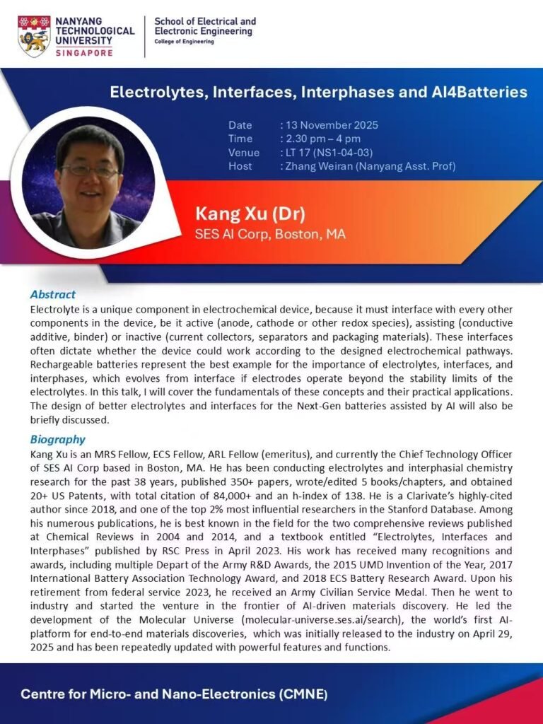 We were delighted to host Dr. Kang Xu (SES AI) at NTU EEE for his seminar “Electrolytes, Interfaces, Interphases, and AI4Batteries.”